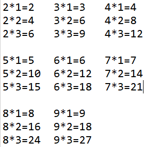 // System.out.print(j + "*" + i + "=" + j*i + "\t");