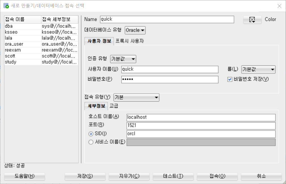 + quick 계정을 사용하여 sql developer에 접속 (SID = orcl)