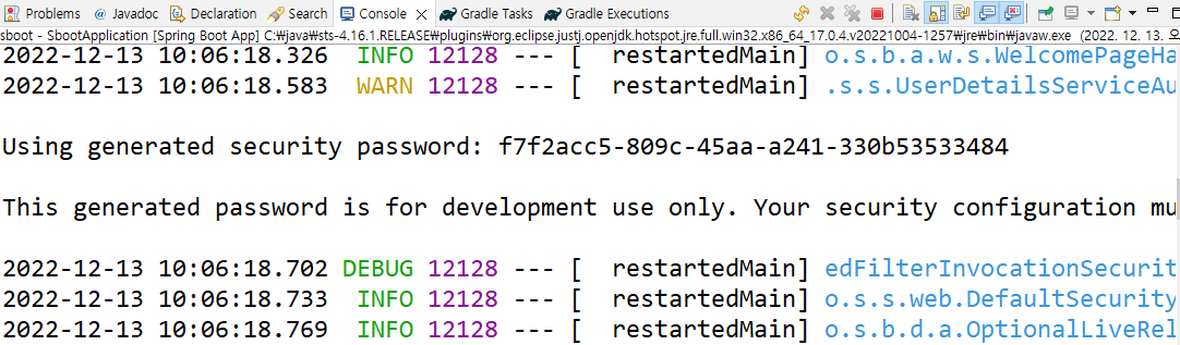Username user와 앱 구동 시 발급된 비밀번호(아래 그림 참조)를 사용하여 로그인을 한다.