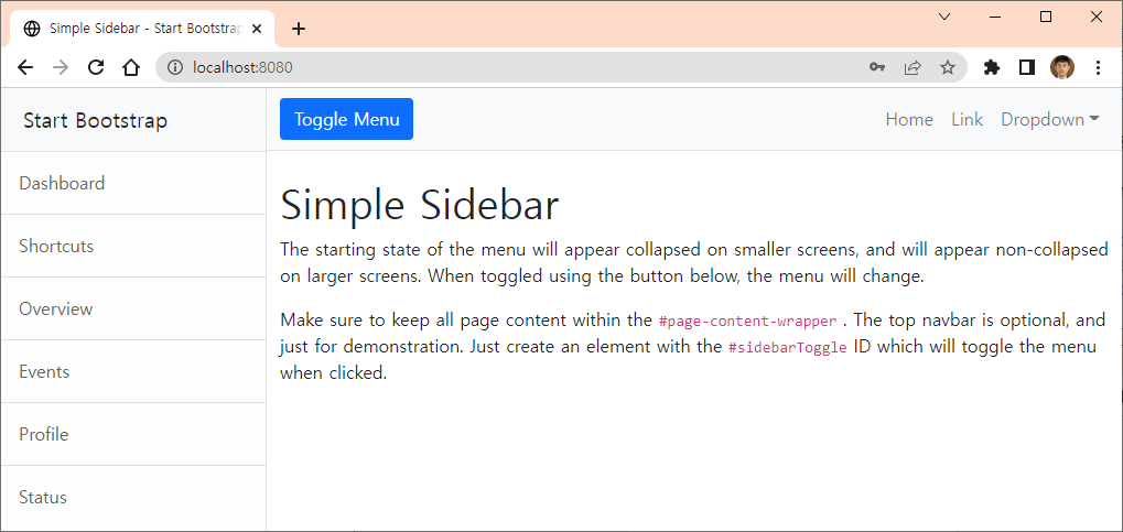 이 글에서는 뷰 페이지를 구성하기 위하여 부트스트랩에서 제공하는 Simple Sidebar 템플리트를 사용하여 화면을 구성하기 위한 설정을 알아본다.