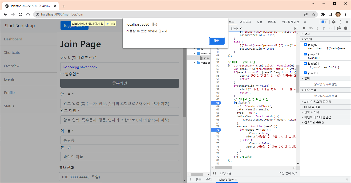 자바스크립트에서는 중복 확인 결과를 받아 사용자에게 알리고, 아이디 중복확인 결과를 변수에 저장한다.