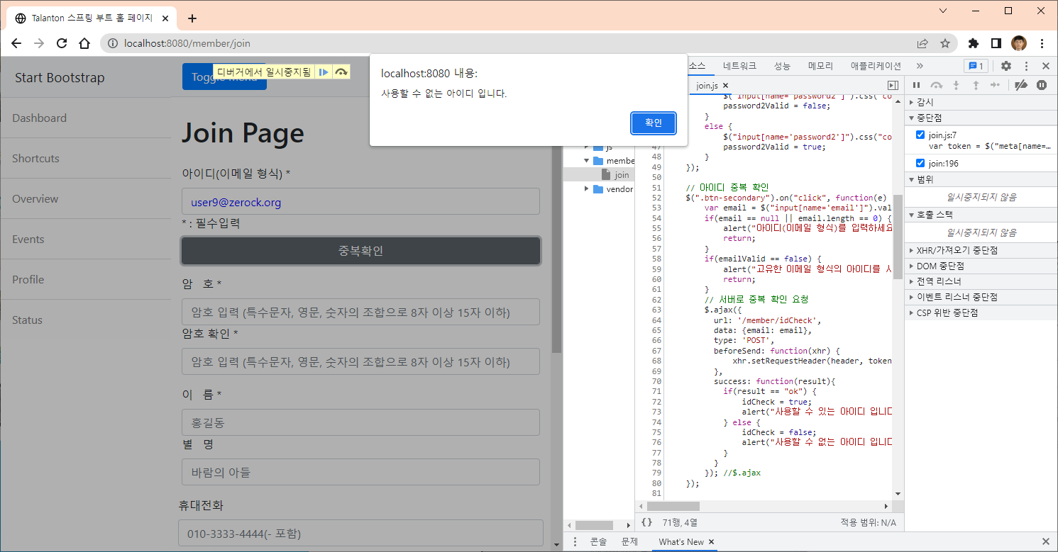 이미 있는 사용자 일 경우는 "사용할 수 없는 아이디 입니다" 경고창이 보여진다.