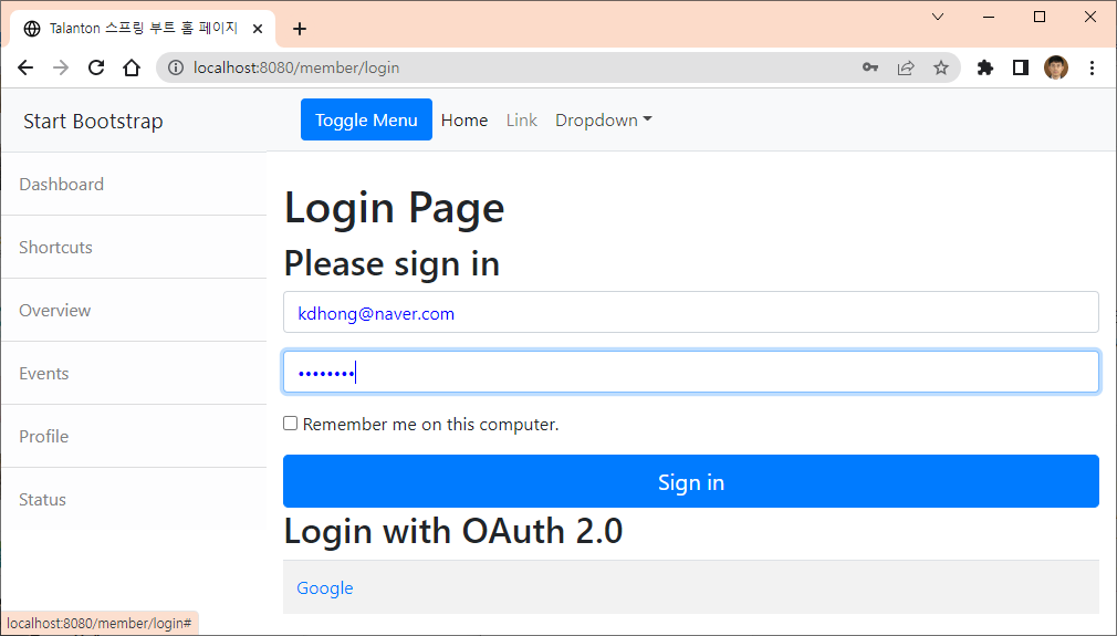 로그인 창으로 이동하며, 회원의 아이디인 이메일이 표시됨을 알 수 있다.