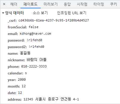 브라우저에서 개발자 도구에서 제공하는 network 탭을 이용하면 서버로 전송되는 데이터를 확인할 수 있다.