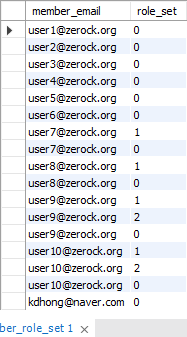 MySQL workbench를 사용하여 회원정보가 member 테이블 및 member_role_set 테이블에 저장이 되었는지를 확인한다.