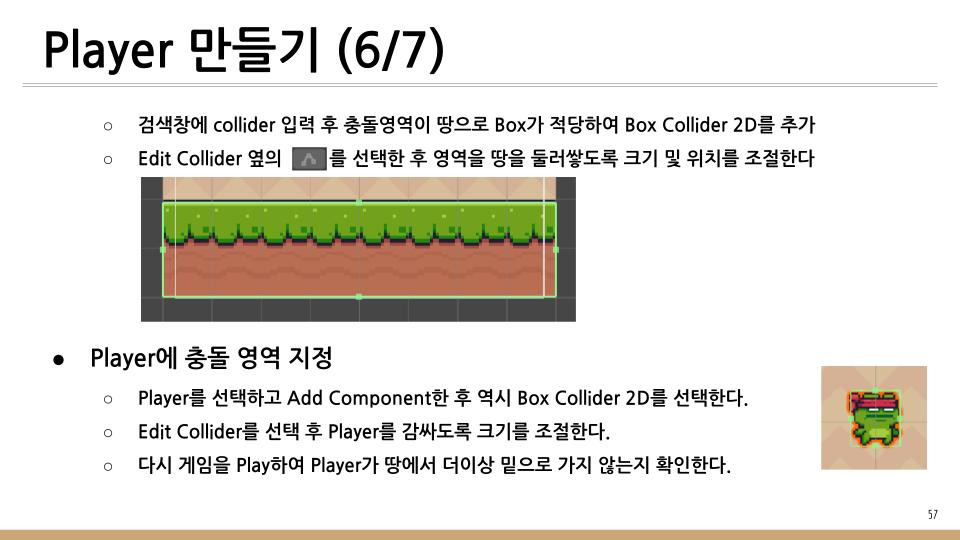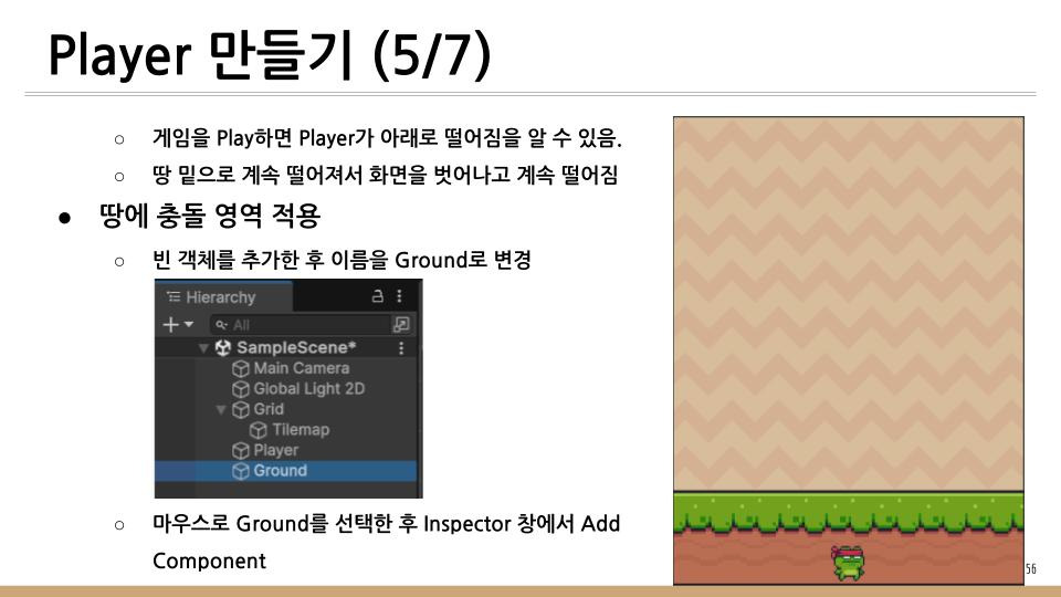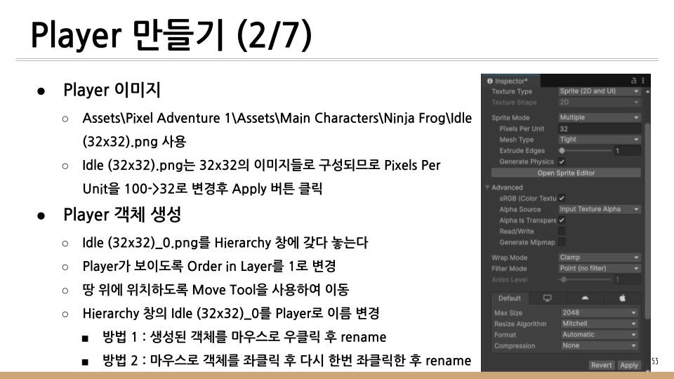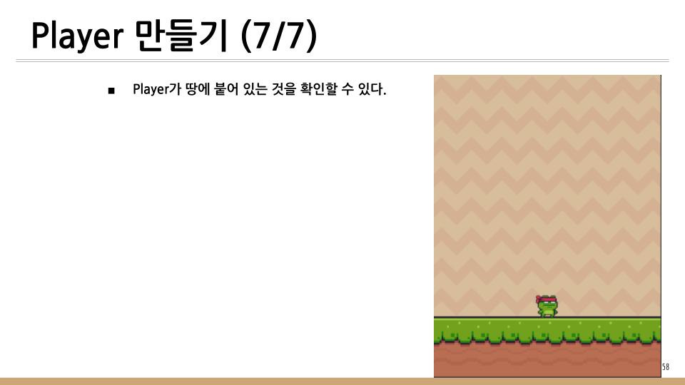 이전 글에서는 게임의 배경이 되는 것과 Player가 이동할 땅을 만들었었다. 이번 글에서는 게임을 Play하는 닌자 개구리를 만들것이다.