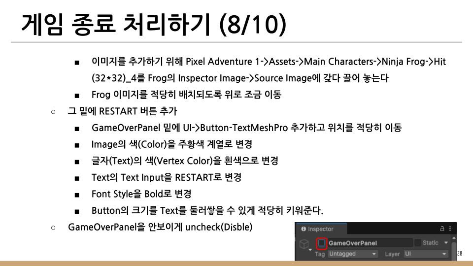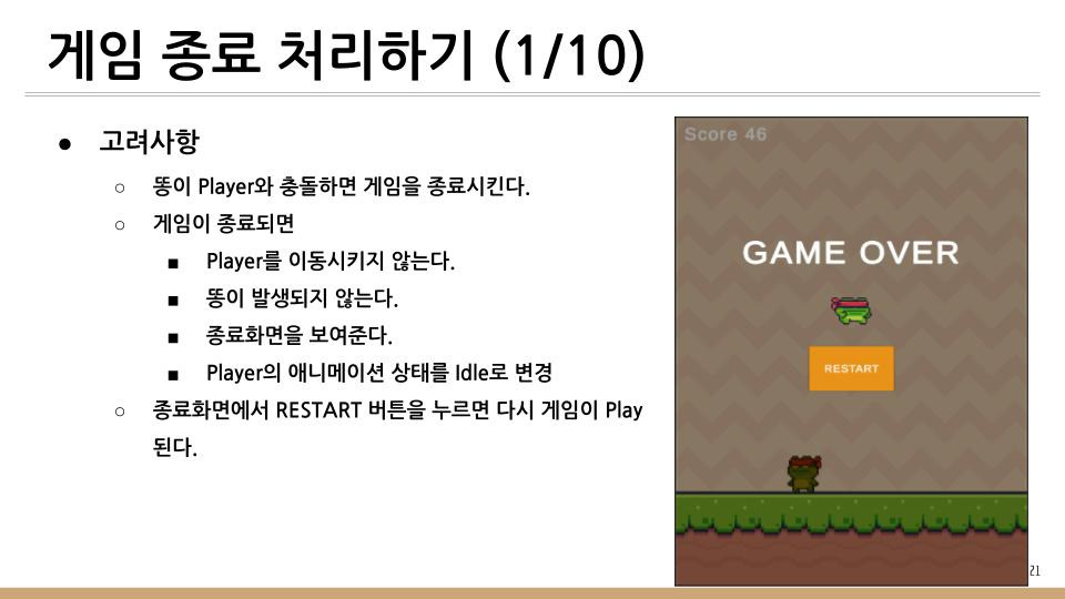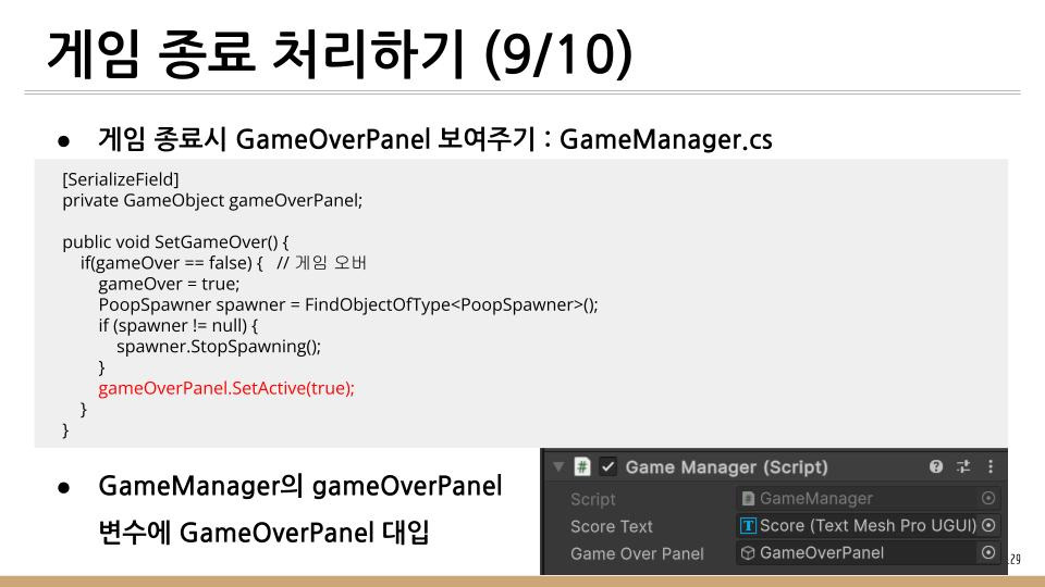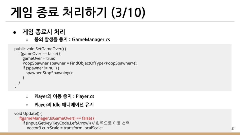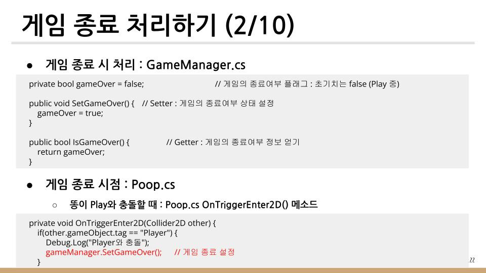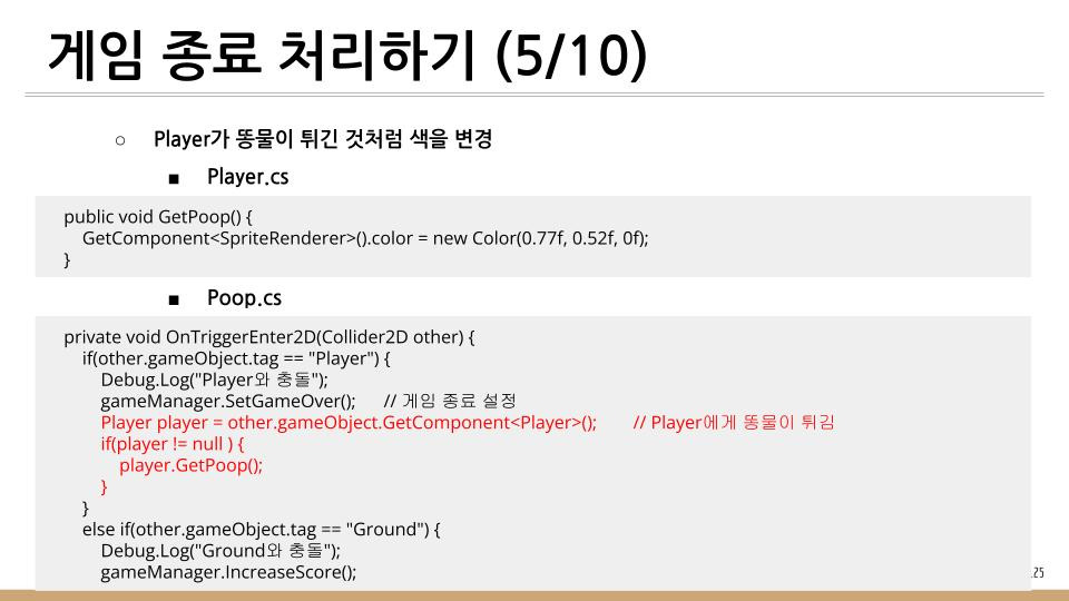 똥 피하기 게임에서 하늘에서 떨어지는 똥을 피하지 못하고 Player와 충돌하게 되면 게임이 종료하게 된다. 이때 처리방법을 기술한다.
