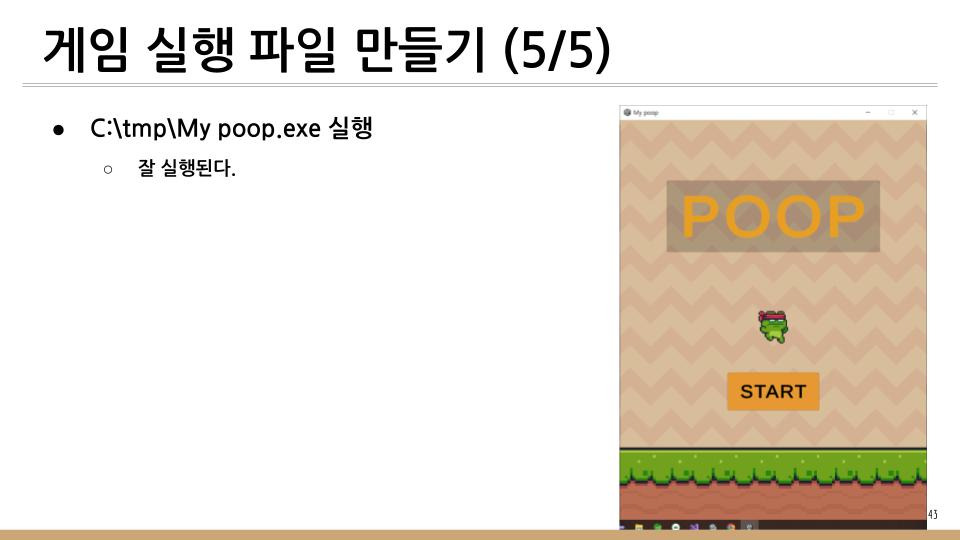 지금까지 연재한 것은 똥 피하기 게임을 만들면서 Unity Editor 환경에서 게임을 실행하였다. 실제 게임 실행은 Unity Engine 없이 실행파일만을 구동하여 실행하여야 한다. 여기서는 그 실행파일을 만드는 방법을 기술한다.