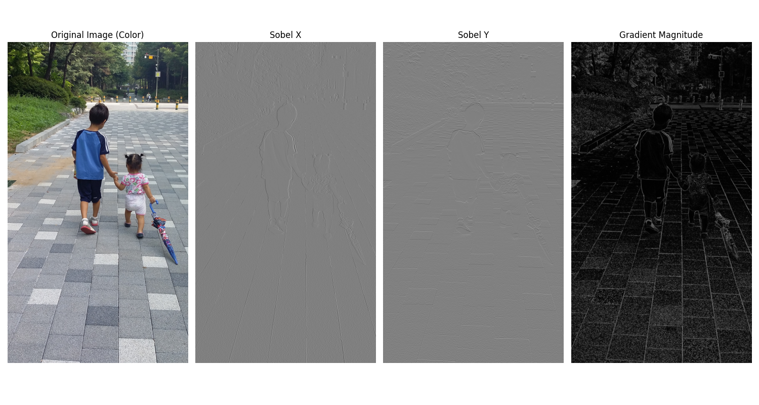 한 장의 이미지를 불러와서 Sobel 미분으로 수평/수직 에지를 구한 뒤, 두 방향을 합친 "기울기 크기(gradient magnitude)"까지 4분할 화면으로 시각화하는 간단, 정석 파이프라인이다.