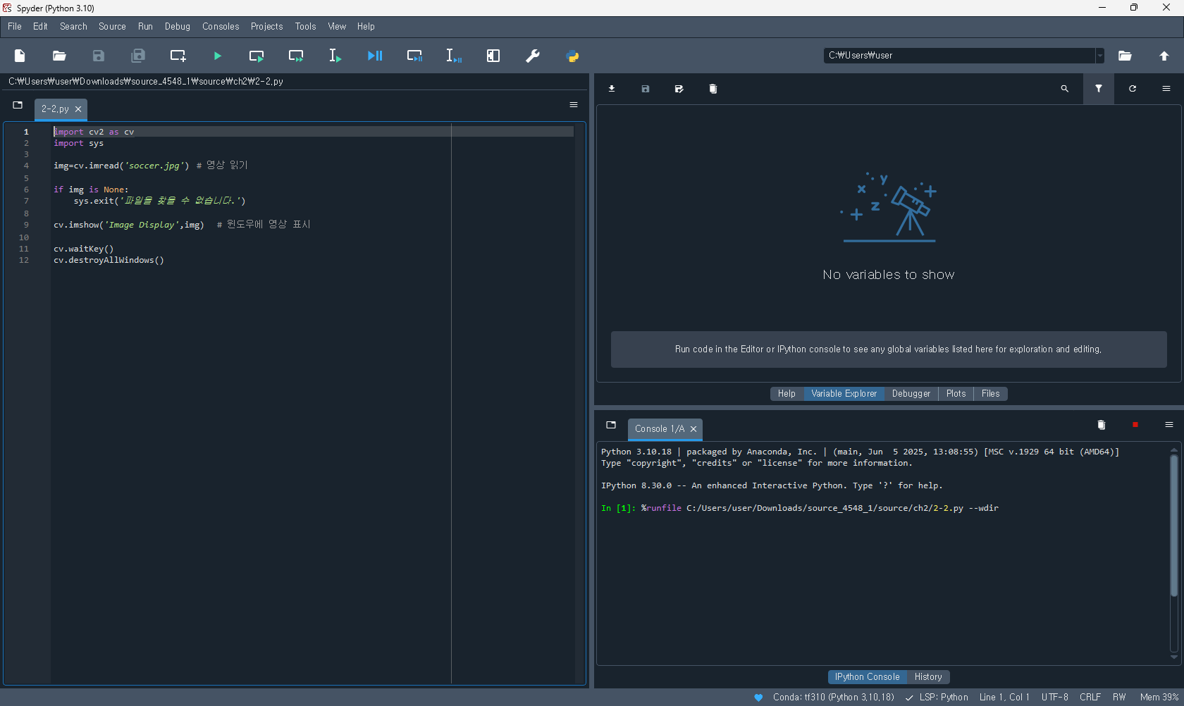 나는 Downloads 폴더에 예제 소스를 다운로드하여 저장하고 spyder에서 폴더를 불러와 실행하였다.