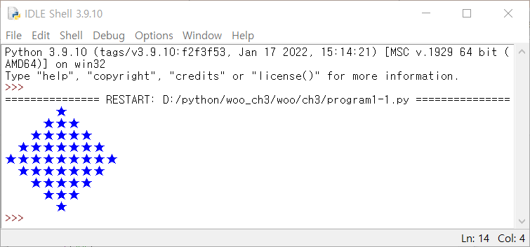 | [프로그램 1] 다이어몬드 출력 (0) | 2023.01.14 |