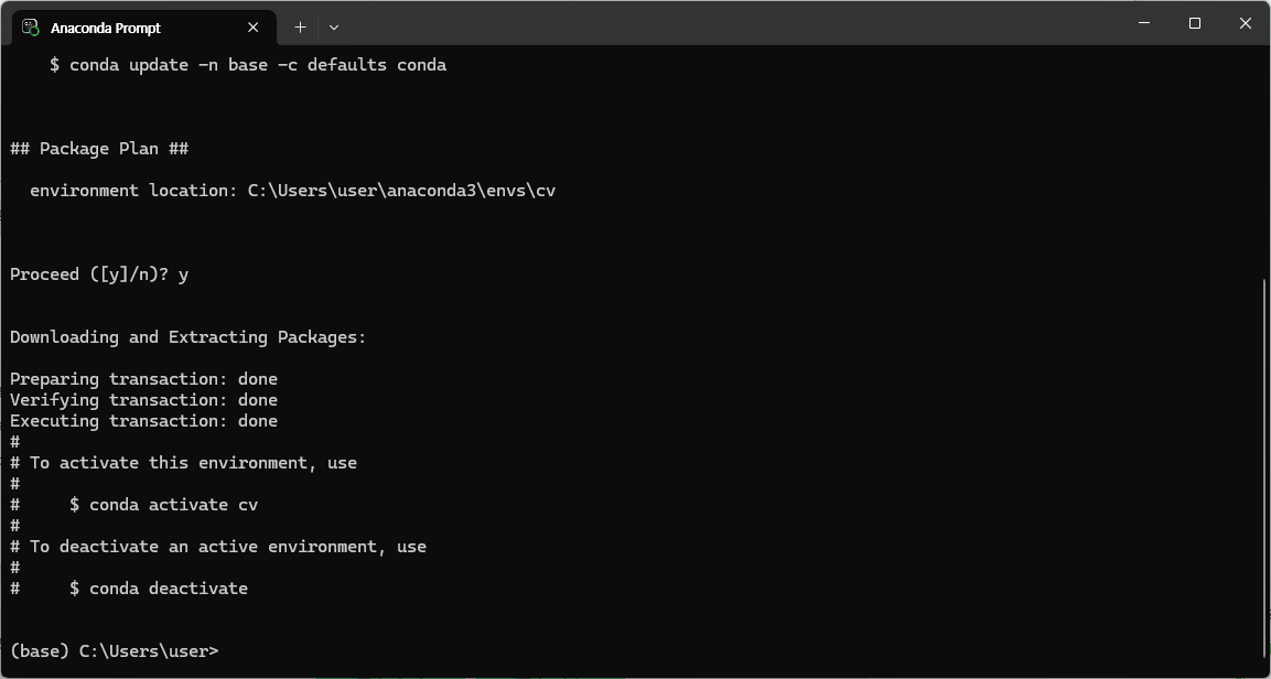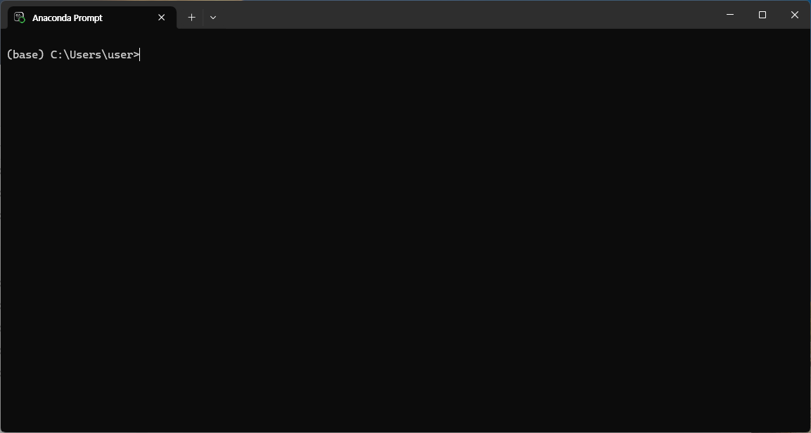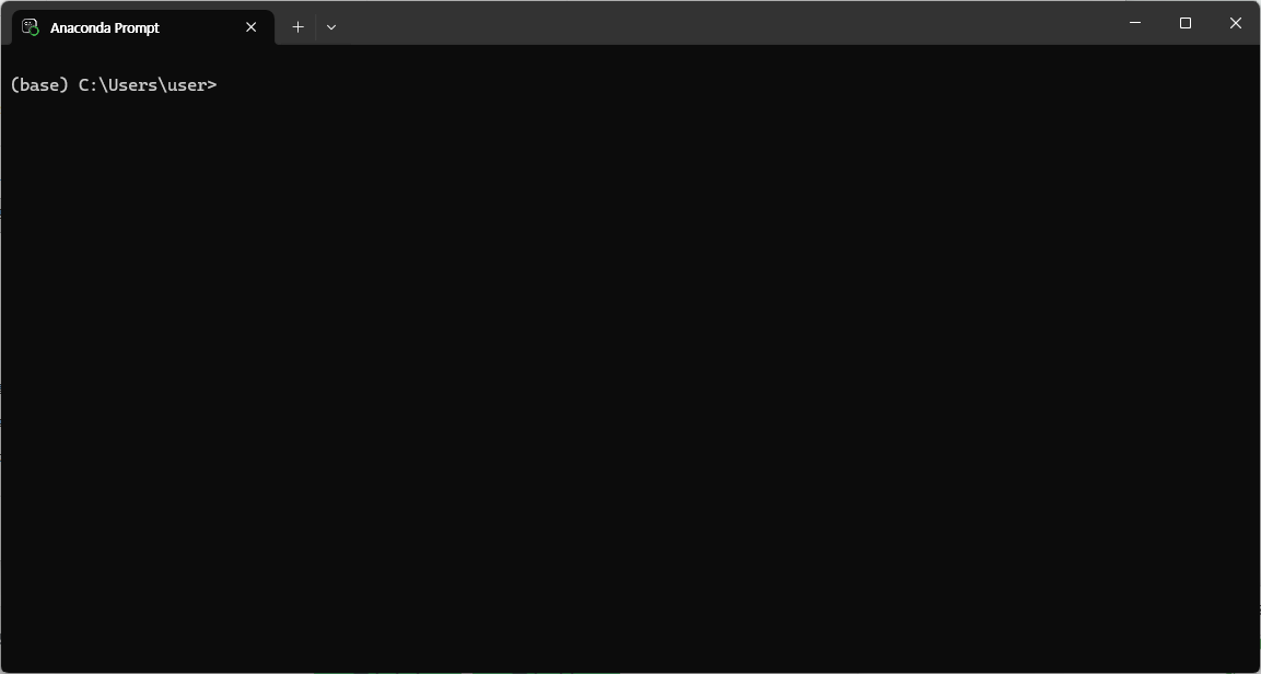 그러면 아래와 같은 console 창이 띄워지고 prompt는 (base) C:\Users\user>가 된다.