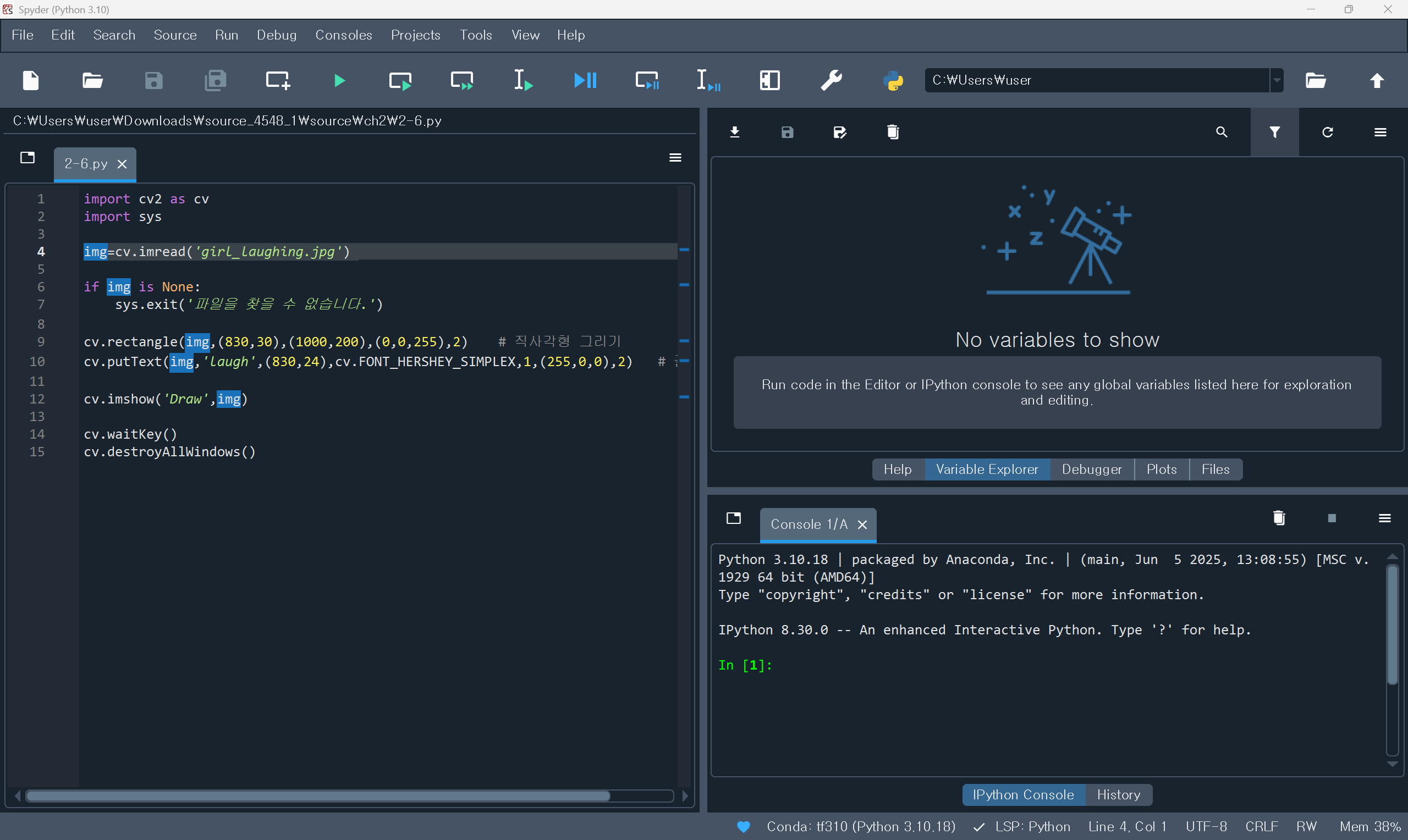나는 Downloads 폴더에 예제 소스를 다운로드하여 저장하고 spyder에서 폴더를 불러와 실행하였다.