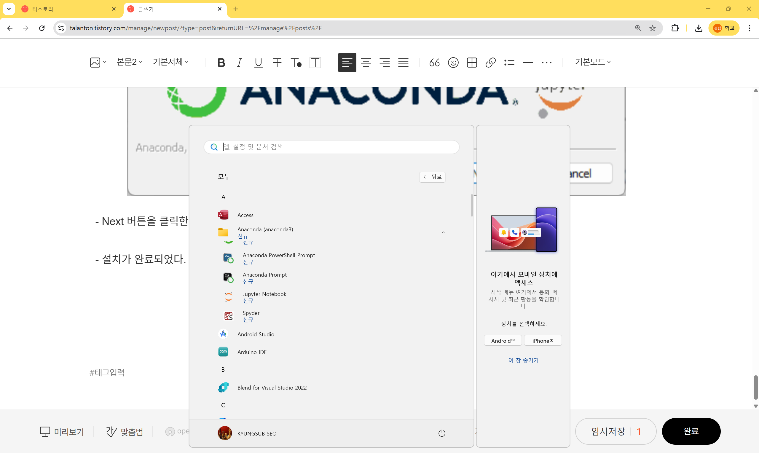 설치를 마치면 윈도우 시작 버튼을 누르고 Anaconda Prompt를 선택한다.
