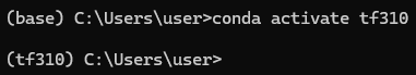 (base) C:\Users\user> conda activate tf310을 입력하여 가상환경 tf310을 활성화 한다.
