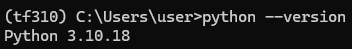 tf310 가상환경은 다음과 같이 python 3.10.18에서 동작하는 것을 확인할 수 있다.