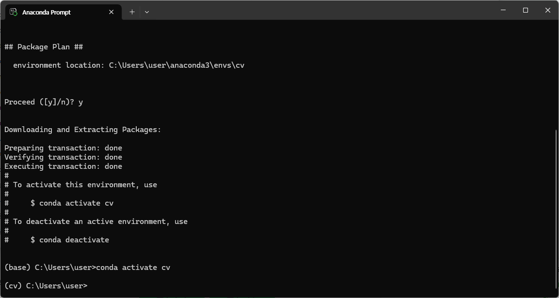 + (base) C:\Users\user> conda create -n cv [enter]
